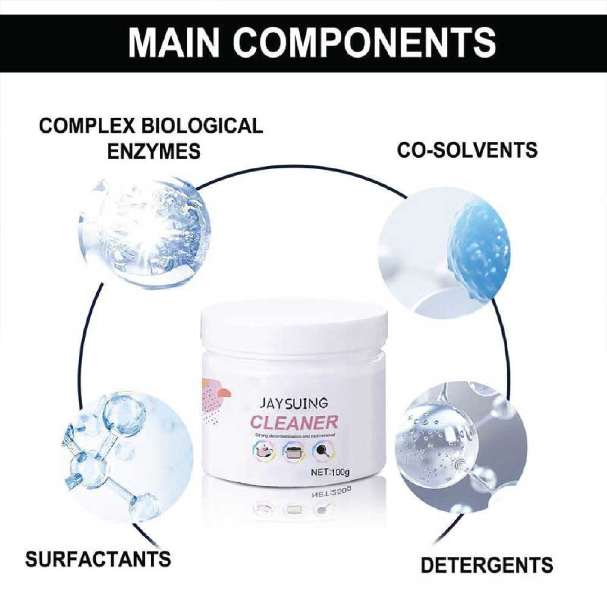 Ingredients: complex biological enzyme, surfactant, cosolvent, detergent, essence Packing size: 7*7*4.3cm